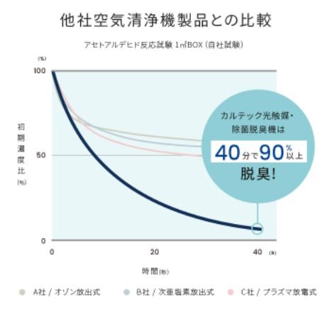 脱臭性能に関しては、カルテック光触媒・除去脱臭機は、「40分で90%以上脱臭!」とあるのですが、これは恐らくは壁掛けタイプの空気清浄機のことだと思われます。