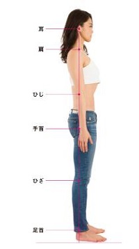 ゼロトレによって各パーツがゼロポジションに戻ると、立った時に「耳→肩→ひじ→手首→ひざ→足首」が地面に対して垂直に、1本の線でつながります。