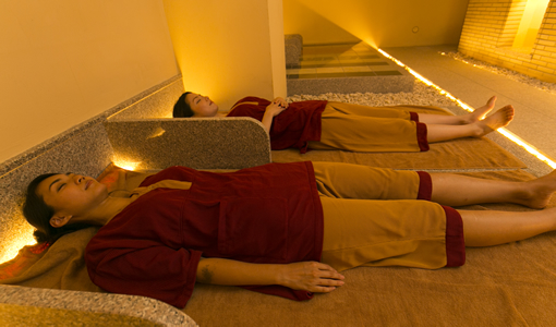 温められた鉱石の上に寝転がり、発汗を促すのが岩盤浴です。