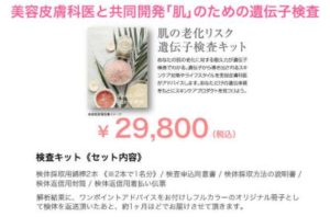 | 肌の老化リスク遺伝子検査キット | 29,800円(税込) | 6種類 | ●約1ヶ月ほどで、あなただけのフルカラー結果冊子が届きます。 | × |