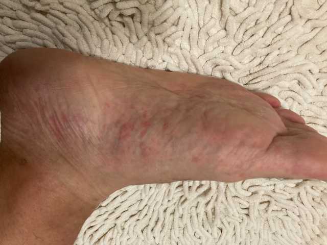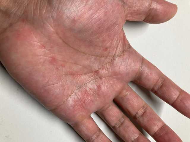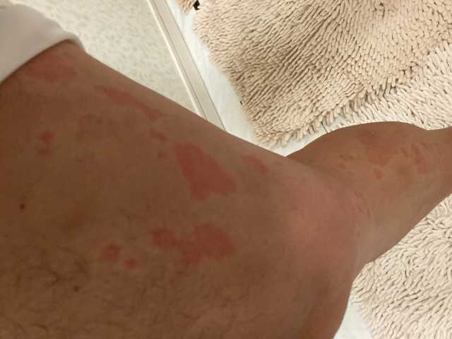 さらに、散歩に出かける前に腕と足に虫よけのスプレーをしたところ、両足にも同じ症状が出て、さらに手の平と足の裏には赤い斑点の様なものも出て、とにかく痒い。