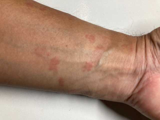 最初は左腕が痒いので掻いたら、赤いブツブツから水疱瘡のような症状がでた。その後、右腕も同じ症状になり、さらに外出する前に虫よけのスプレーを腕と足にもかけたら、両足も赤くなった。