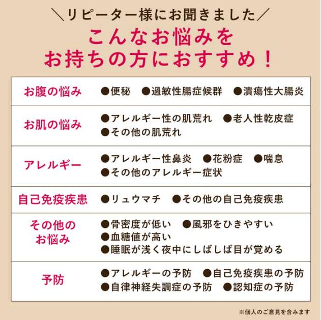 従って本来「効果」をうんぬんすることはできないのですが、こういった症状が改善されたという口コミを見て、その「効果」を期待されて飲む方は多いかと思います。